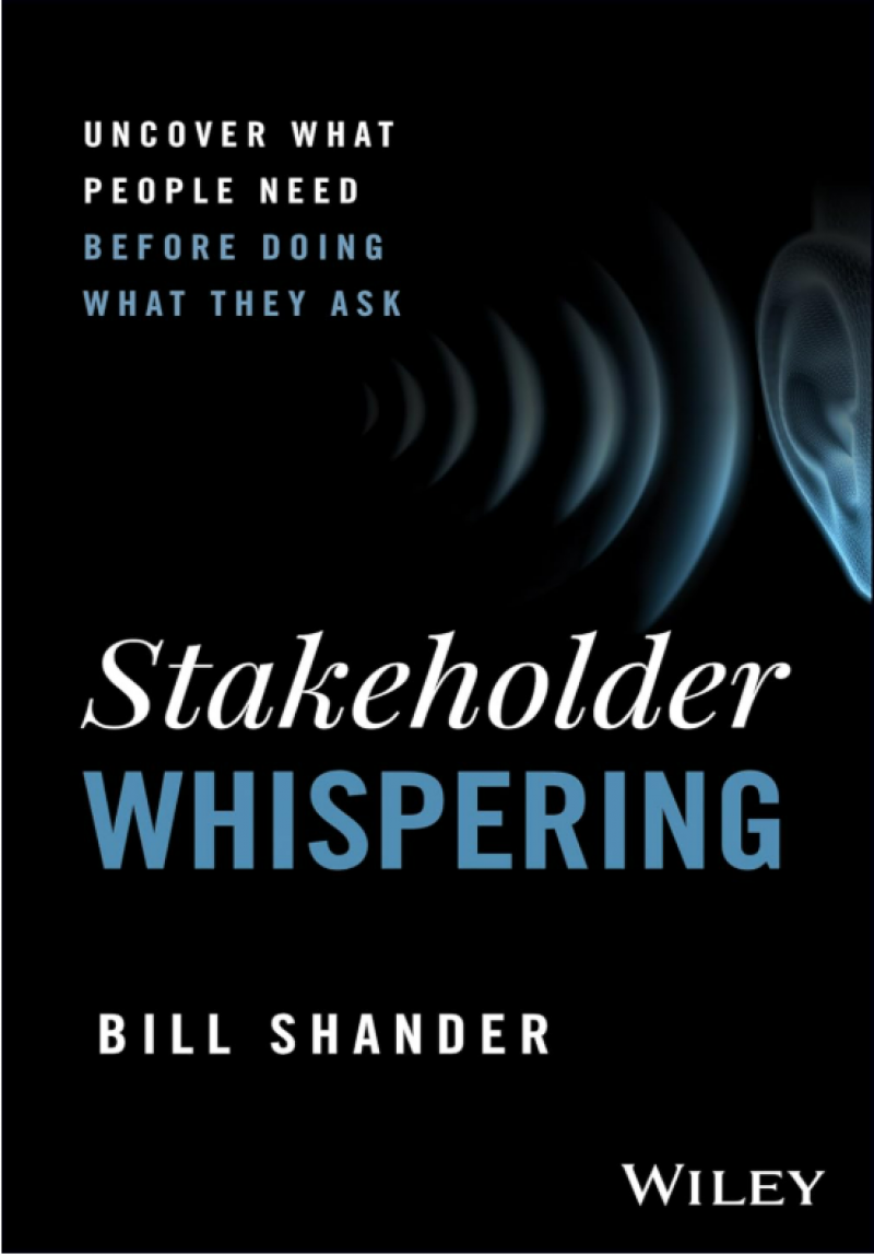 Stakeholder whispering:uncover what people need before doing what they askby Bill Shander WileyPeople don't know what they need. The wants we communicate to others are shaped by our subconscious and the familiar, and limited by what we think is possible. But they don't always reflect our actual needs. In Stakeholder Whispering, author Bill Shander demonstrates how to get from your stakeholders' "order"―what they're asking for―to what they really need. You'll learn how to uncover the needs and desires of your clients, colleagues, bosses, customers, and other stakeholders based on what they ask for and how they ask for it, and how to deliver products and services that meet those needs.